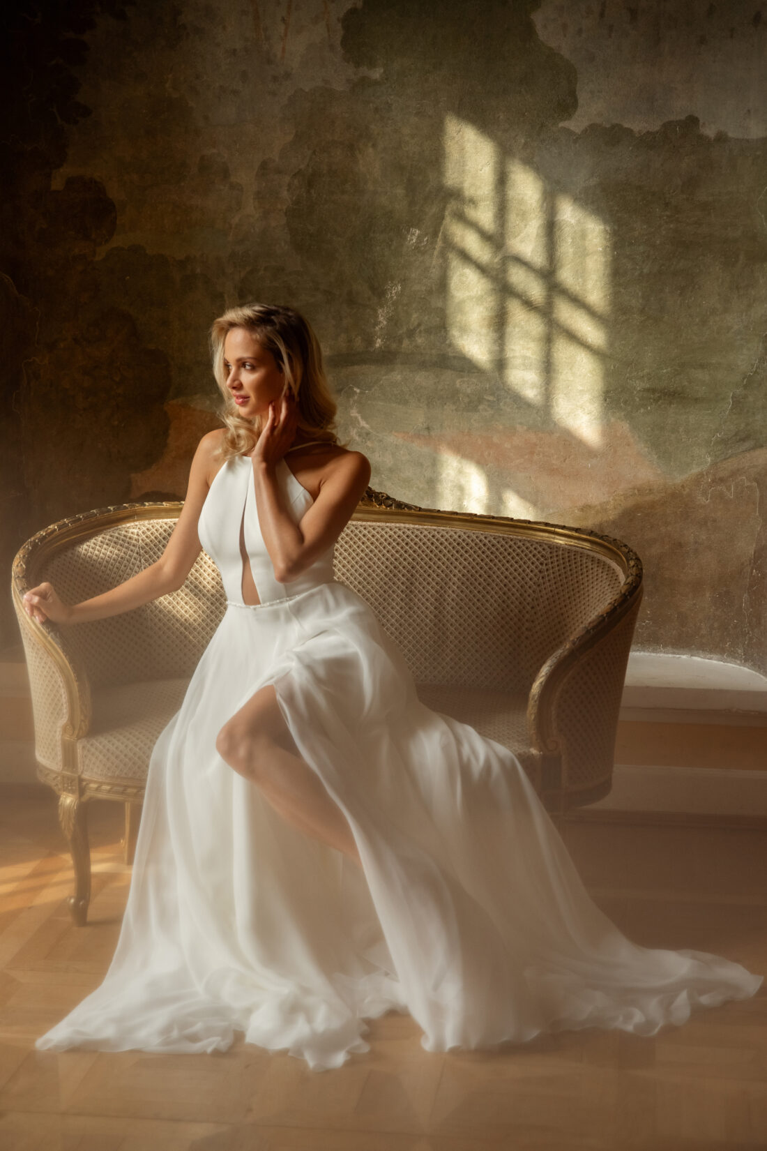Das Brautkleid Aida von Rina Cossack besticht durch seinen hohen Neckholder-Ausschnitt, der dem Design eine moderne und zugleich elegante Note verleiht. Ein feiner Gürtel mit zarten Perlendetails betont die Taille auf dezente und stilvolle Weise.