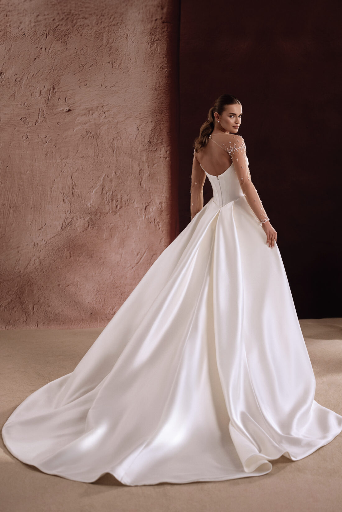 Der edle, leicht glänzende Stoff verleiht dem Kleid eine moderne Strahlkraft und sorgt für einen cleanen, luxuriösen Look. Eine angesetzte Schleppe rundet das Design ab und bringt eine Portion Dramatik – ohne auf Schlichtheit zu verzichten.