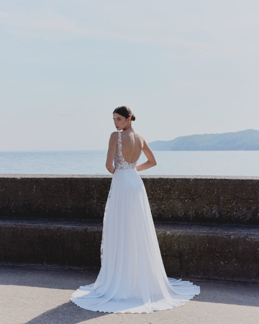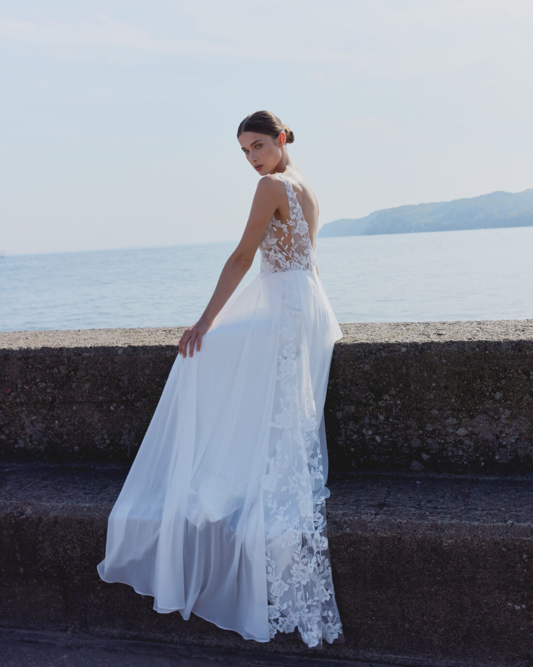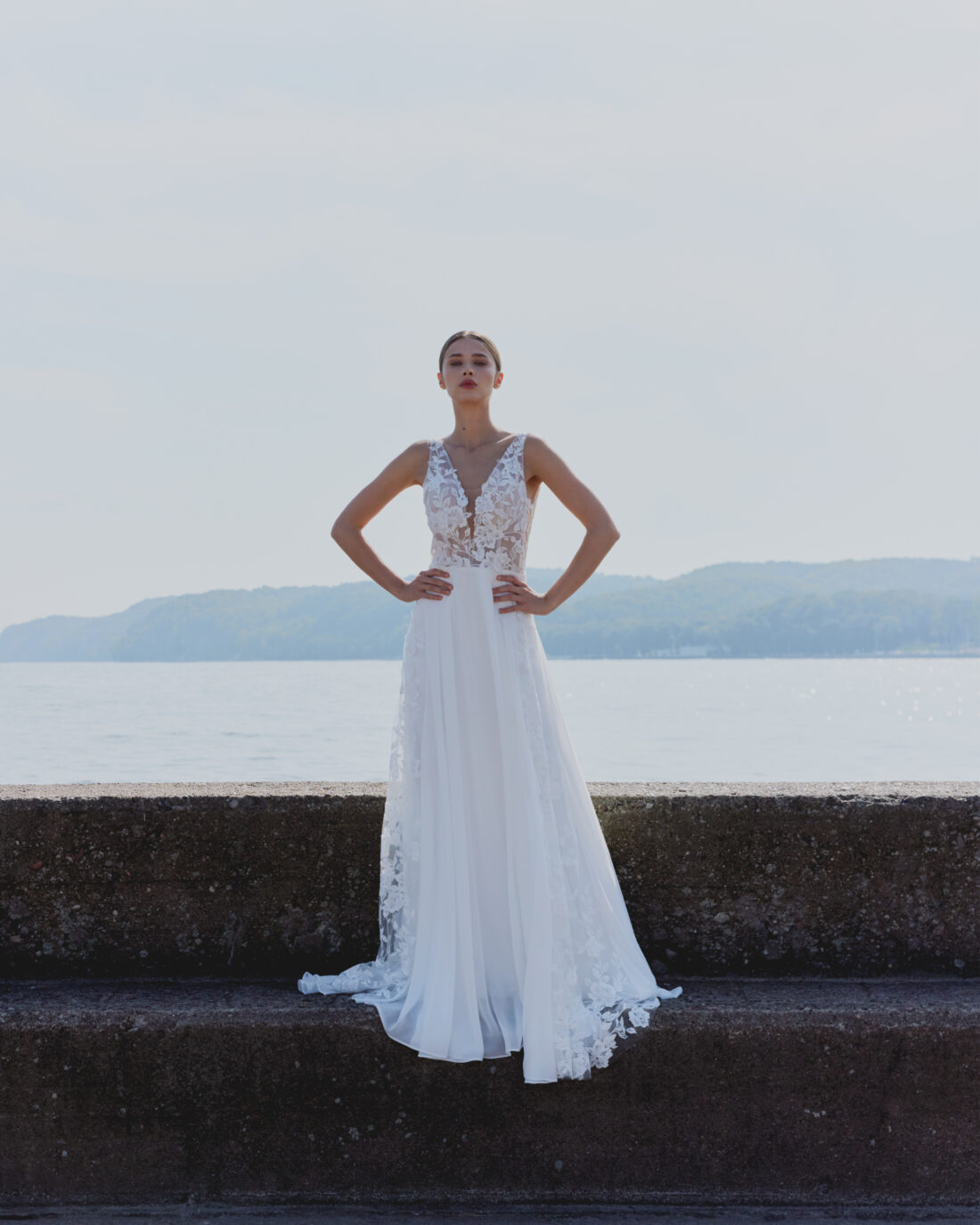 Ob für eine Sommerhochzeit im Freien, eine festliche Feier im Schloss oder eine urbane Trauung – Nadeen ist das perfekte Brautkleid für Bräute, die ein romantisches Spitzenkleid mit modernen Akzenten suchen.