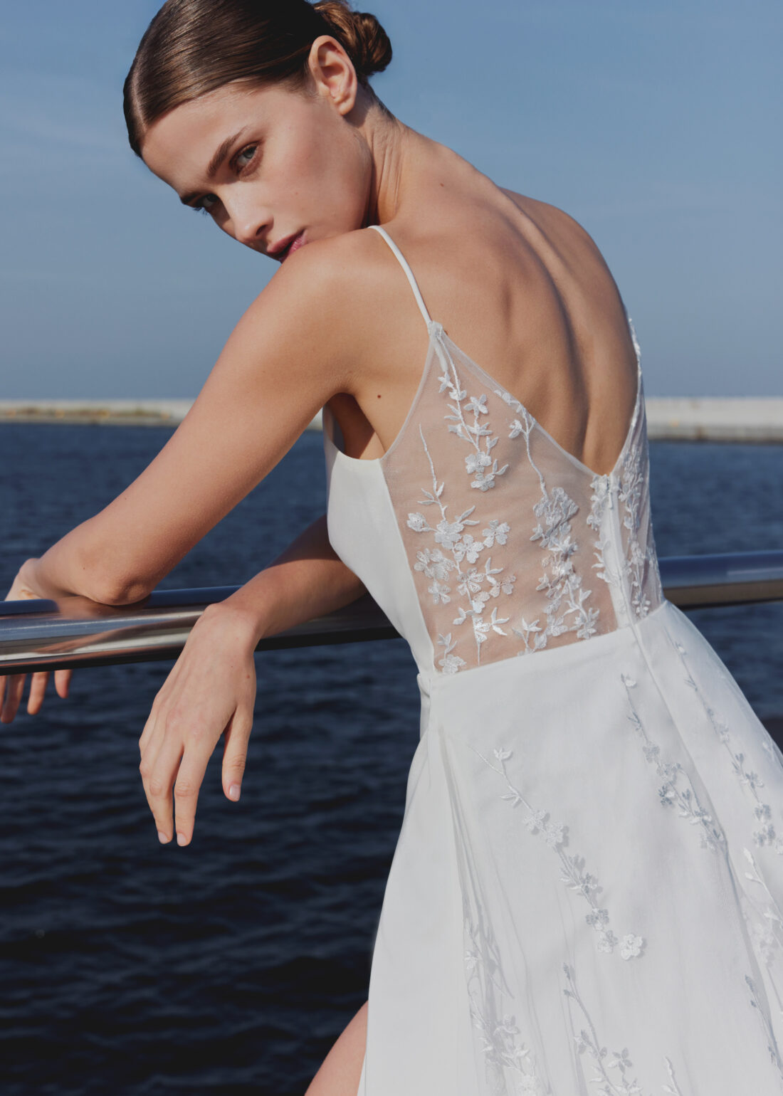 Das Brautkleid Narcis von Amy Love Bridal verbindet pure Eleganz mit modernen, femininen Details. Die zarten Spaghettiträger und der gerade Wasserfallausschnitt verleihen dem Kleid eine edle Zurückhaltung, während der spitzenbesetzte Rücken für einen romantischen Hingucker sorgt.