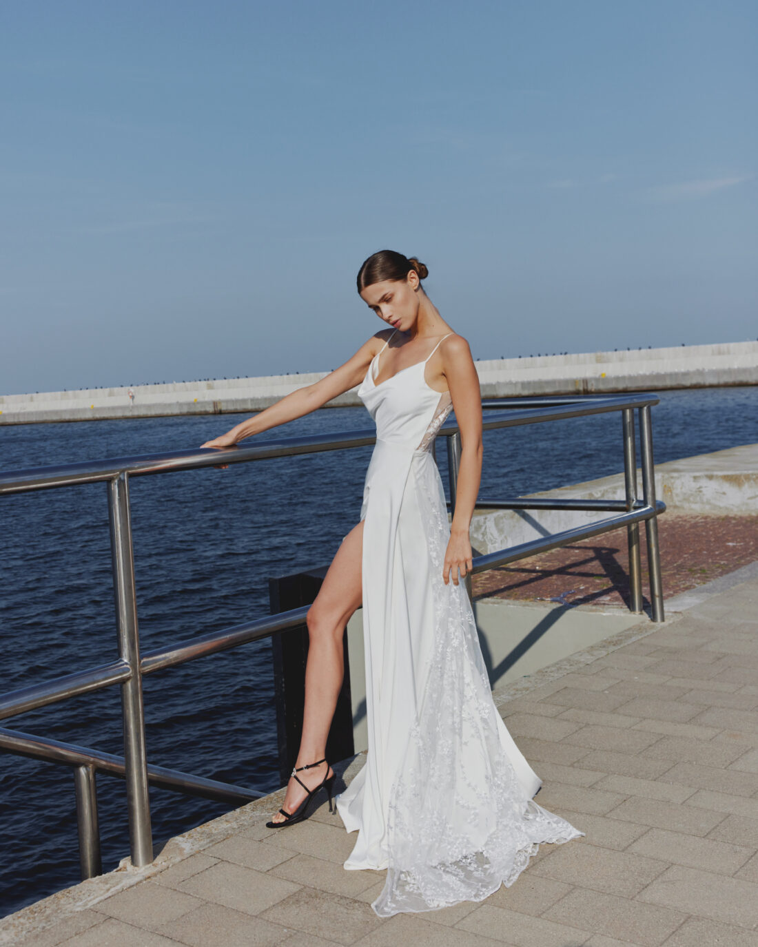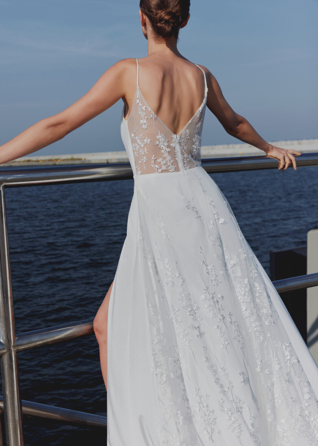 Der fließende Stoff umspielt die Figur sanft und sorgt für ein unbeschwertes Tragegefühl – perfekt für Bräute, die sich ein leichtes und zugleich glamouröses Kleid wünschen. Ein hoher Schlitz vorn bringt eine moderne, sinnliche Note ins Design und schenkt maximale Bewegungsfreiheit. Das Highlight ist die angesetzte Spitzenschleppe, die dem Kleid einen Hauch Dramatik und Eleganz verleiht.