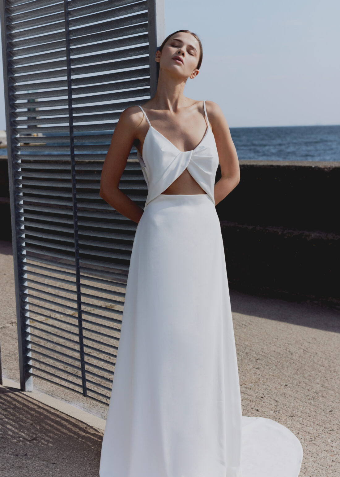 Das Brautkleid Nature von Amy Love Bridal verkörpert Minimalismus und Eleganz in Perfektion. Mit zarten Spaghettiträgern und einem raffiniert gedrehten Stoff im Oberteil entsteht ein moderner Look, der durch den Schlüssellochausschnitt am Bauch subtil aufgelockert wird.