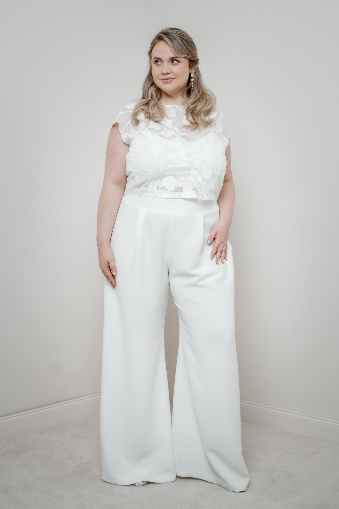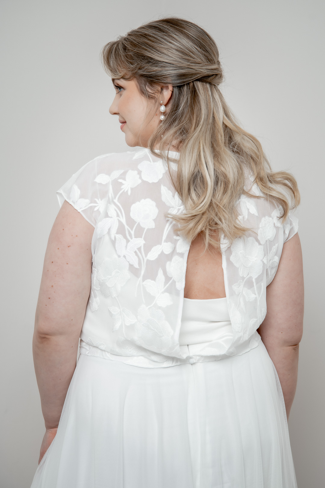 Das Brauttop lässt sich wunderbar mit schlichten, fließenden Röcken kombinieren und ist perfekt für ein Mix & Match Brautoutfit geeignet – ob für die standesamtliche Trauung, die freie Zeremonie oder als romantisches Highlight bei einer Sommerhochzeit.